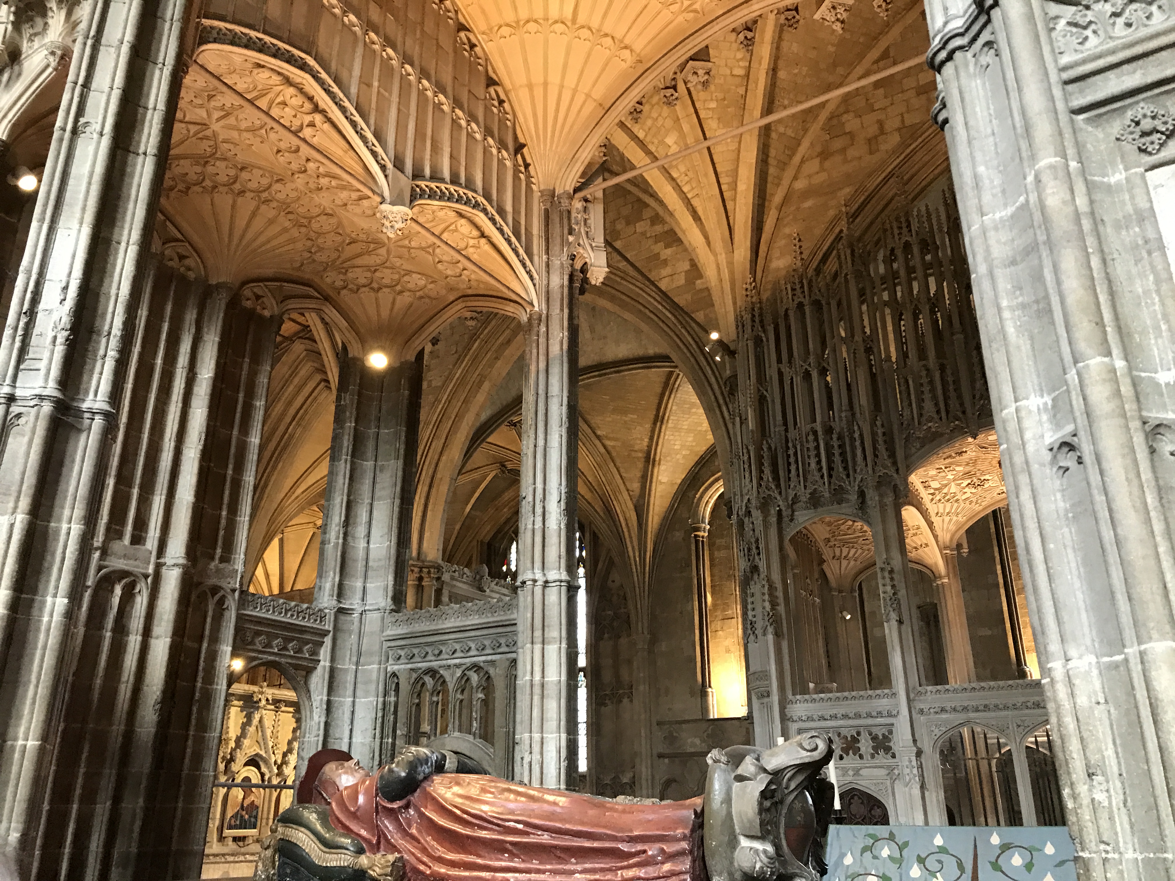The Cathedral was on our agenda for all the great Tudor events. Henry VII and his wife Elizabeth Woodville came to Winchester for the birth of their first child. Ever hopeful it would be a boy and heir. They wanted to have the connection to the Saxon kings who were crowned in Winchester and its connection to Arthur and the knights of the round table legend. Luck was on their side at this time and their first child was a boy. They even named their son Arthur for a further connection to the past. Arthur was christened in the Cathedral and our tour guide went through all the pomp that went with that event. If you think we decorate a lot for weddings and church events we have nothing on the Tudors. Spun gold cloth was hung as well as tapestries and new silver and gold candlesticks were added to the church accoutrements.