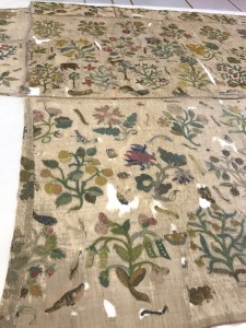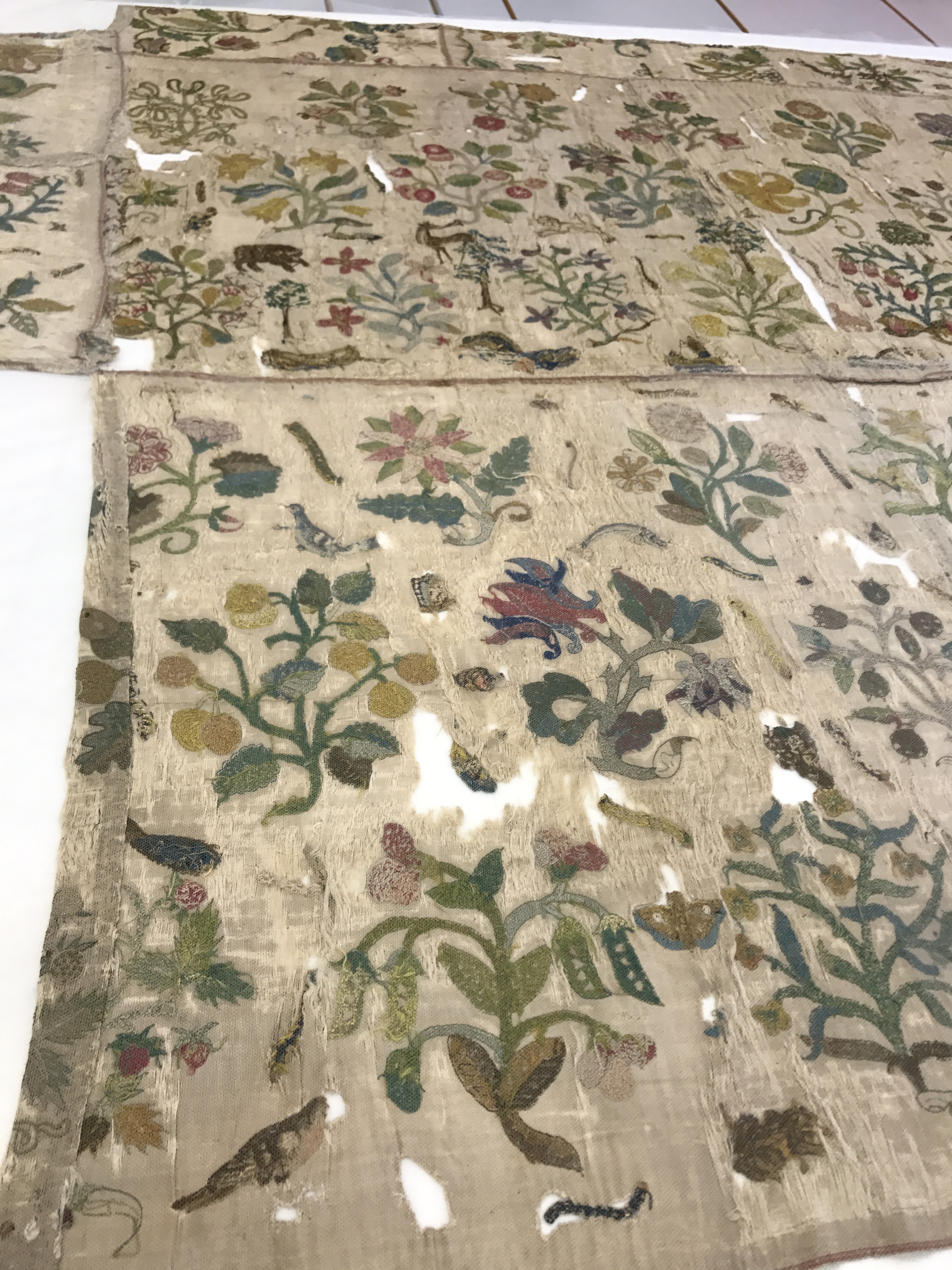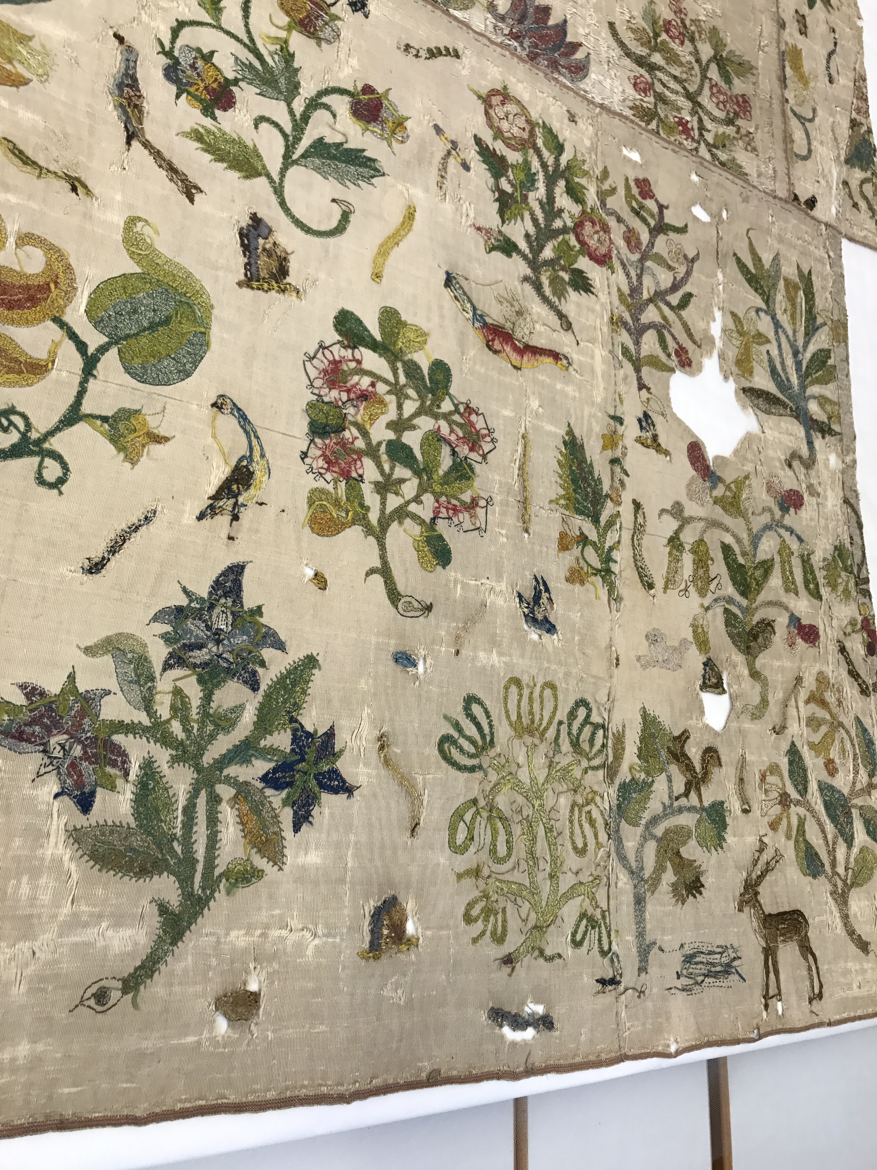 Anyway they have a conservation facility at the palace that holds their treasures that are not currently on display or in various stages of conservation. So we got to go back behind the scenes to see the fabric laying on a work table and meet the women doing the work. She had taken the back off and displayed it so we could see all the colors that had been protected by the linen backing. What originally looked like muted fall colors were actually bright vibrant flowers. She explained how she painstakingly cut off all the backings by snipping each thread which she surprisingly kept in a plastic bag. She also kept all the linen squares that had been used to back it. It was exciting to see the actually piece.