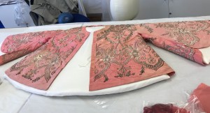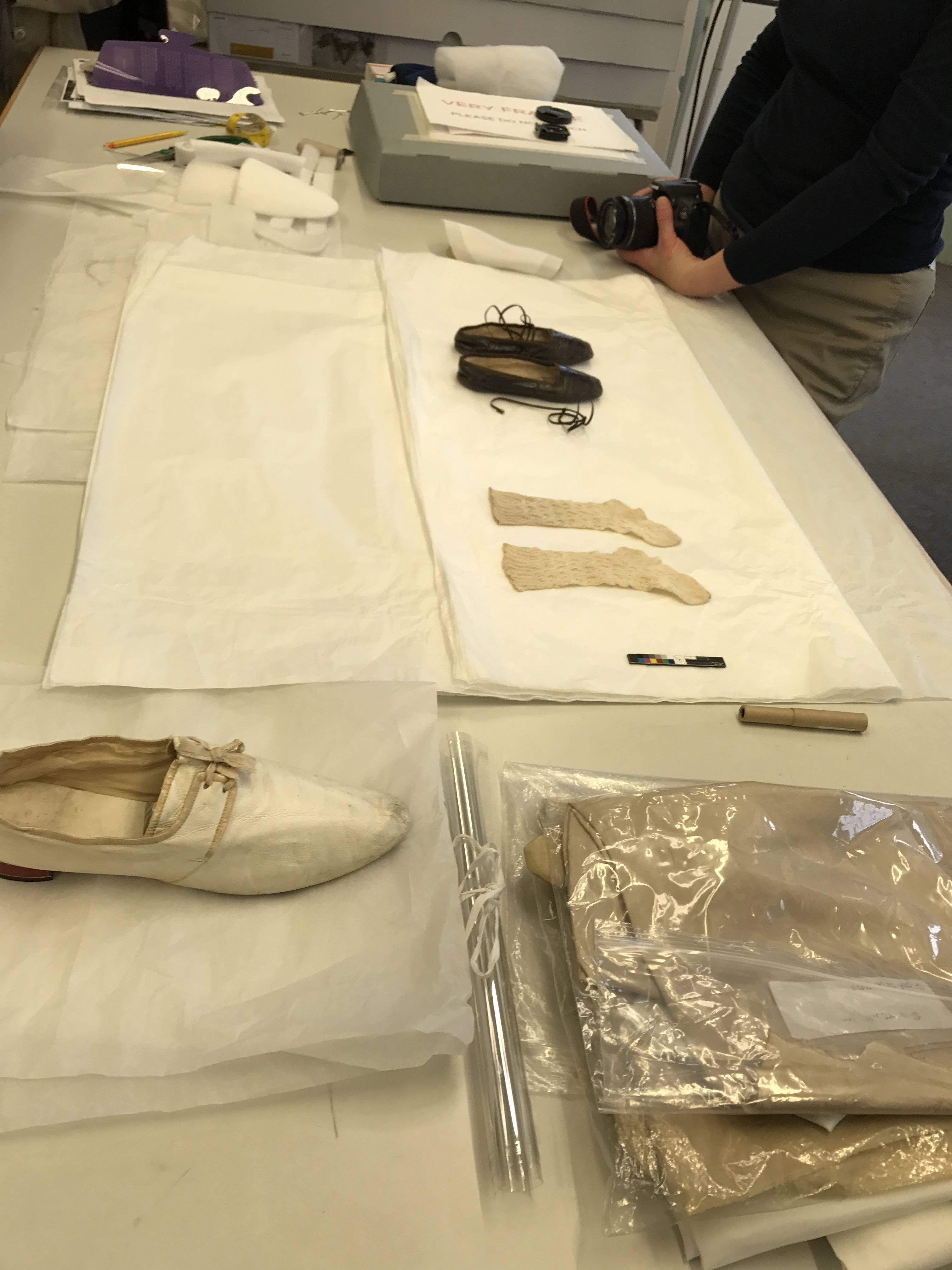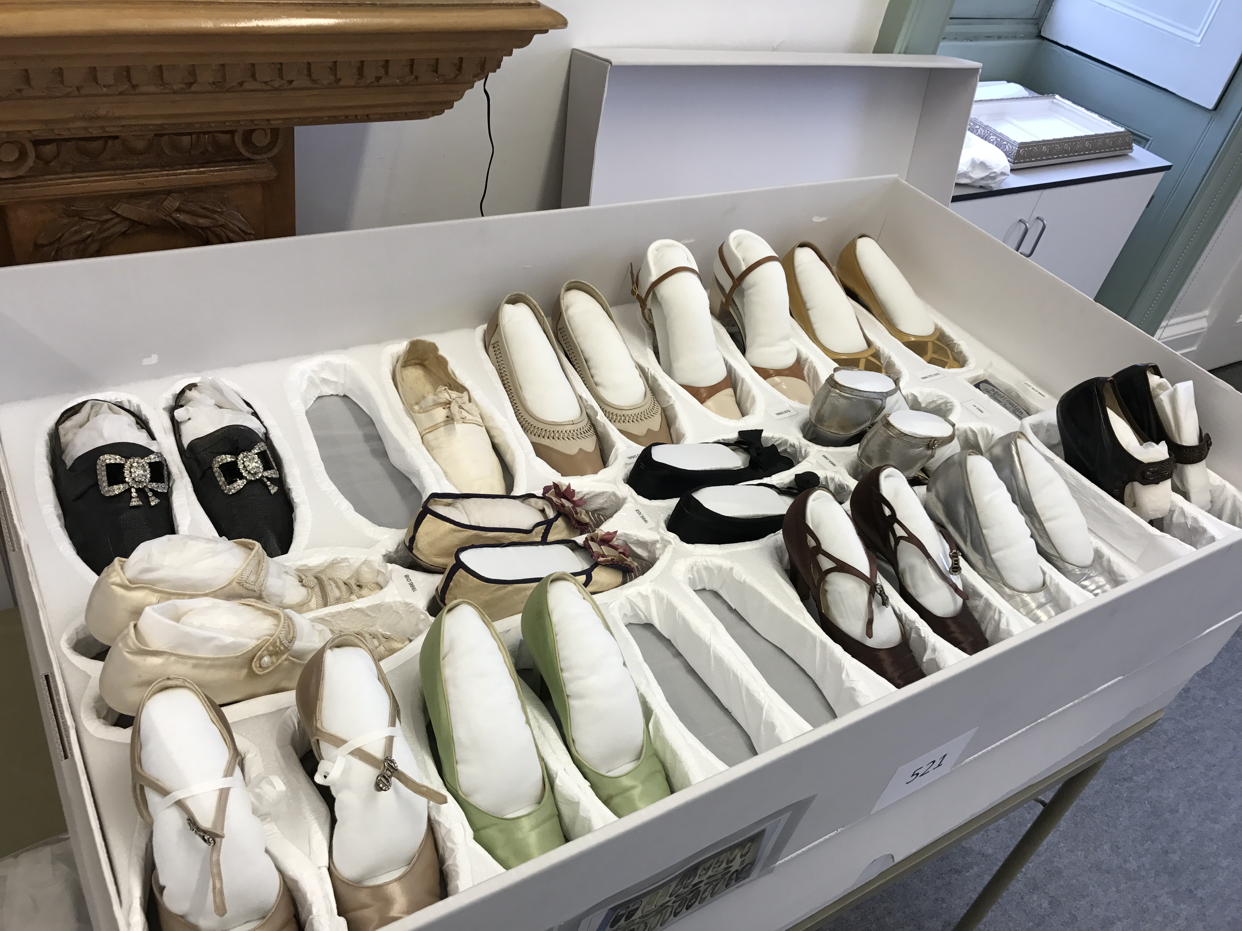 She also showed us a short swing walking coat of Queen Victoria’s she wore in her early days with Prince Albert. Someone else was working on a pair of baby shoes and socks from one of Victoria’s children for a display at Kensington. Sitting to the side was a box full of shoes from Victoria’s children.