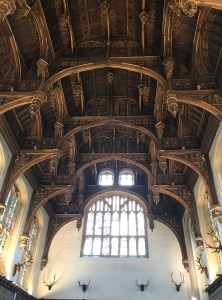 The highlight of the Palace is the ceiling in the chapel. Unlike some of the other chapels we have toured this one actually is what we would think of as a chapel. It was just part of the Palace not huge but did cover two floors. The ceiling is the best surviving example of a Tudor painted ceiling. It is a dark blue with gold. All the woodwork is gold and ornate. Since you view it from the second floor you got a nice view. No photos I tried to copy some from online but it didn’t work.