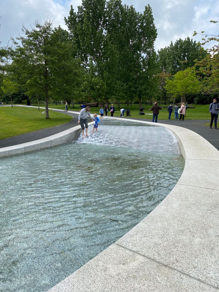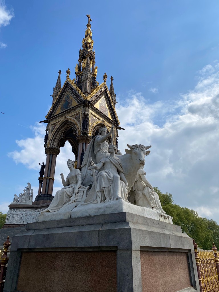 We picked up our packets for the tour – name badge, luggage tags, hand sanitizer and a rapid Covid test. Nice reminder that things have changed. Anyway we got our luggage dropped off and headed out for a quick walk through Hyde Park. Our hotel is quite nicely situated and just a short walk to several sites. Hyde Park is more walking trails and green space than the flower gardens of St James Park that we walked through yesterday. There are flowers but father apart. The sun was shining so it made for a nice morning stroll. We went back by the Prince Albert’s memorial so a few more pictures of that will show up today. We also saw Diana’s fountain which is more wading lazy river than fountain. It had a nice peaceful feel to it even with the kids running through the water. We had to hurry back for the welcome lunch at the hotel. Excited to see some people from our last tour and get started.