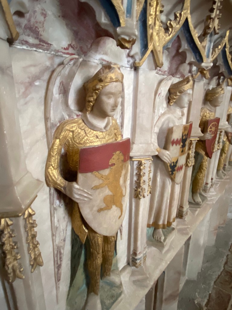 Julien Humphrey had joined our tour and he gave the talk on the Dutches the church and Chaucer and his grandson. The tomb was surrounded in what Julien called winged and clothed angels. It had both a beautiful carving of the Duchess is all her finery and then carved again as a corpse. There was some argument among the historians of whether this represented the fact that regardless of who you were or what you had or had accomplished in life everyone turned into a rotting corpse or on the gentler side it was just a representation of the times that included the Black Plague. Either way it is still creepy. (As are the angle toes that are in one of the photos). The church also had a portion of a 14th century tile floor. That seems almost incomprehensible in American terms.