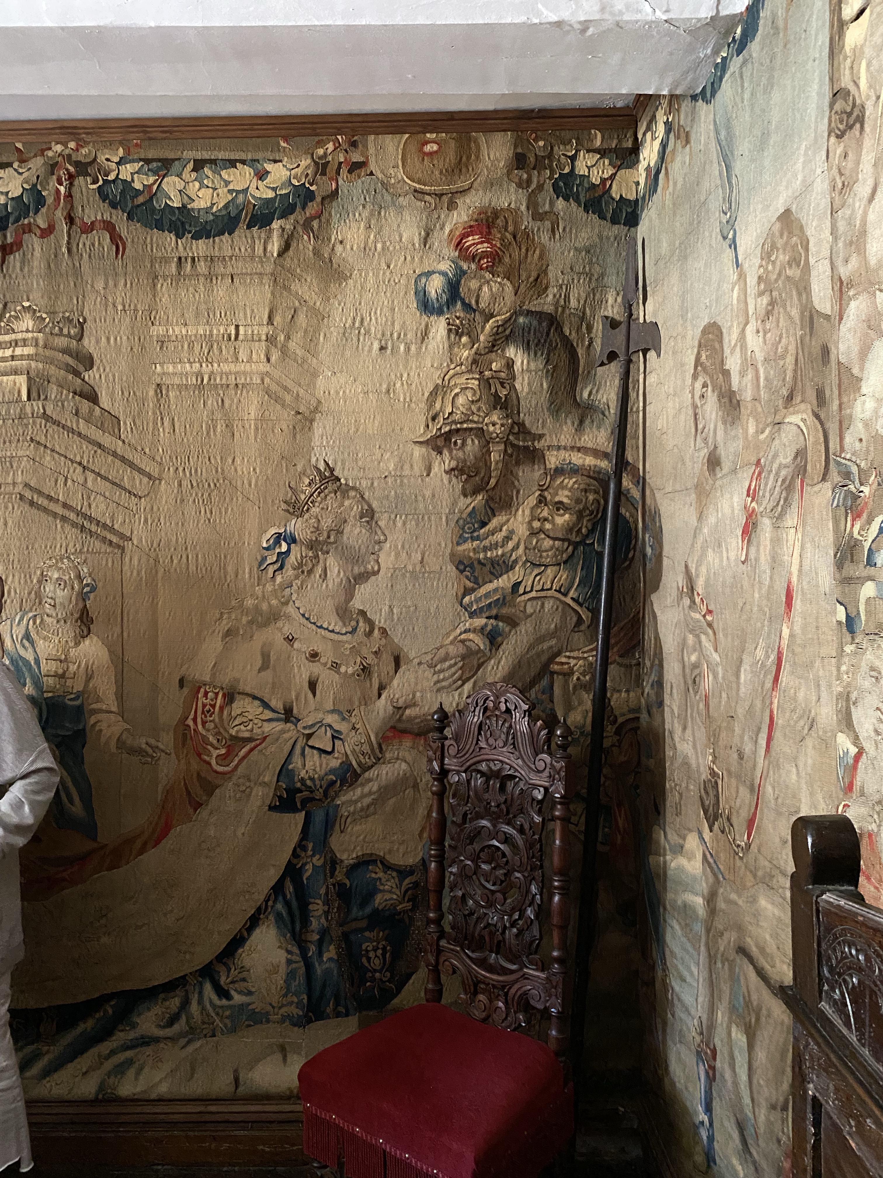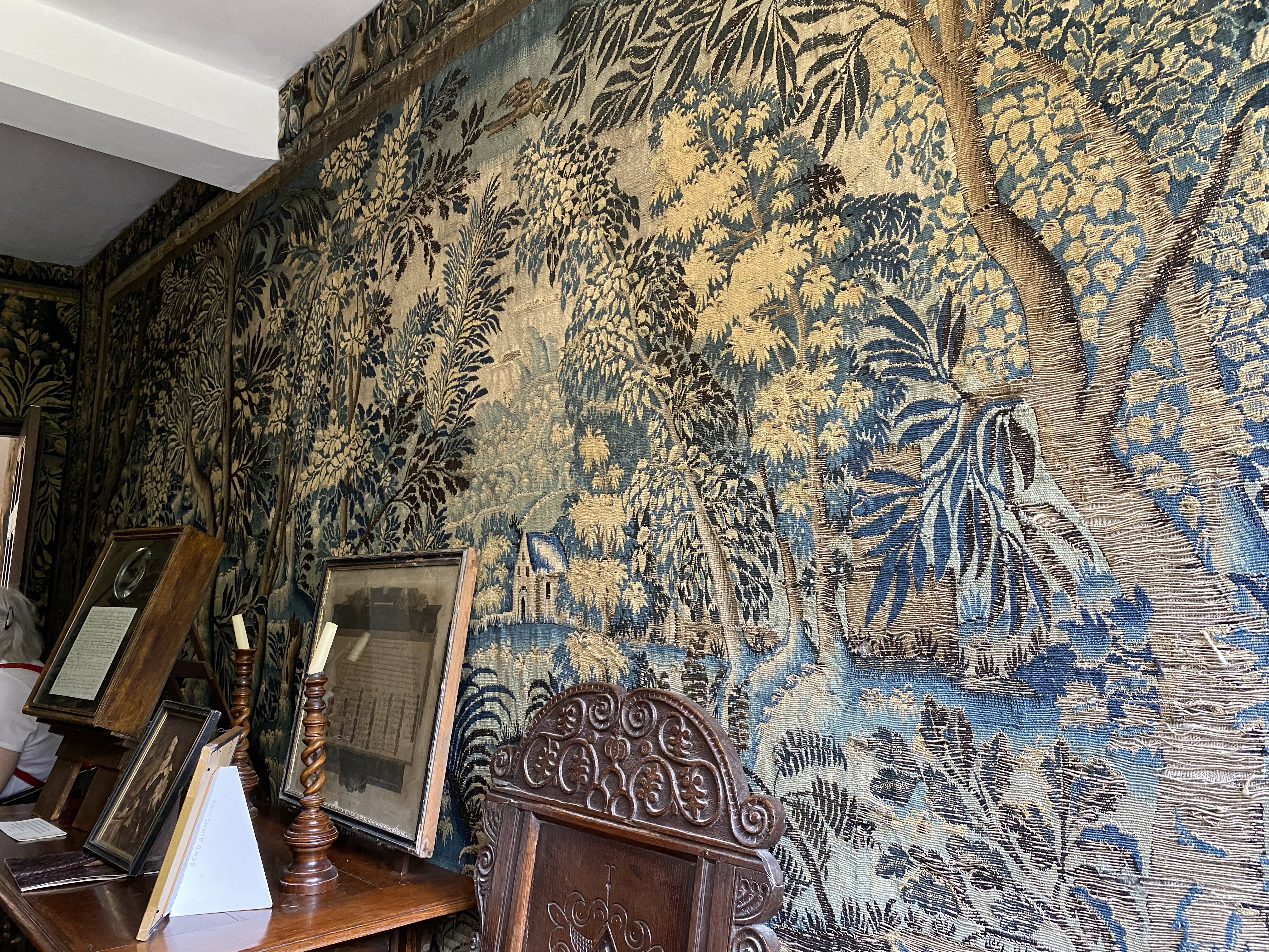 The highlight were the bedrooms with full tapestry wall coverings. The tapestries had been in the room since the 16th century and were made for the room. The owner said they were removed to be cleaned by the V&A Museum and he said they had to come out to visit the house before they would let them be rehung. They had to make sure the house was suitable place for them. (He said having hung there for 400 years should have been good enough evidence that the room had suitable conditions.) The tapestries in one room were said to be the style of the Americas which made them more valuable to the V&A. Basically they were various woods or tropical plant scenes. It was an interpretation of what they thought America would look like. The other room had different scenes one of a knight and one Roman scene. There was also a spot behind the bed that was missing the tapestry for centuries but was recently found wrapped around a pipe in the basement. It has been returned to its spot you can see that it is brighter.
