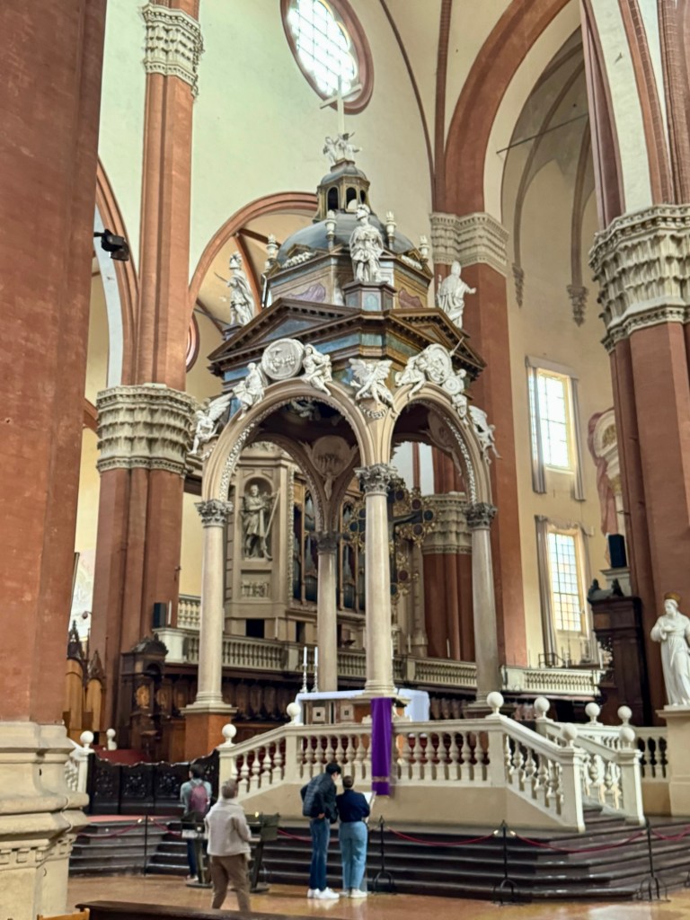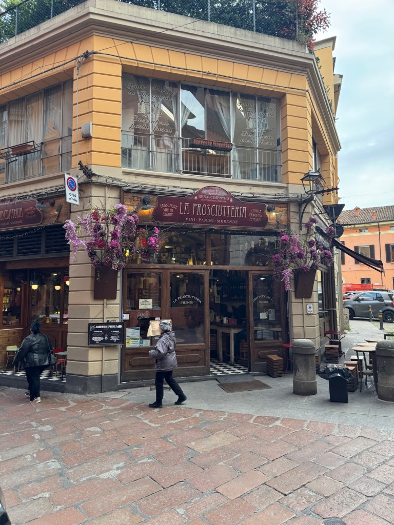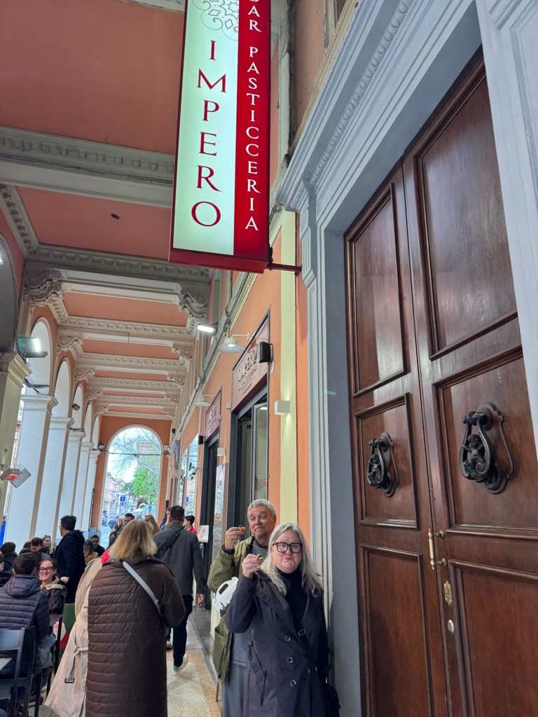 We headed out relatively early to catch the train to Bologna. It was only about a 45 minute train ride so we arrived before lunch. First stop was for coffee and pastries. Bob’s niece had lived in Bologna and provided several recommendations. The Impero Bar and Pasticceria was quite popular but those with drinks were able to find seats. I just had a lovely slice of sacer chocolate cake so I stood outside.