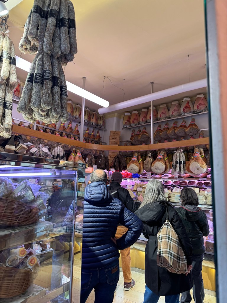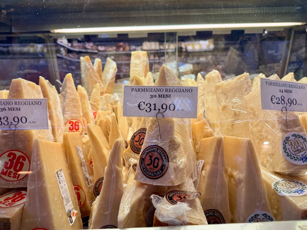 I wanted to get some cheese to take home (vacuum sealed) so we headed out to a cheese shop. First one was small with huge wheels of parmesan but more local and no sealed cheese. Second one was more promising but all the cheese was in huge chunks. Not that I wouldn’t have loved that much cheese my suitcase space is limited. so the hunt continued.