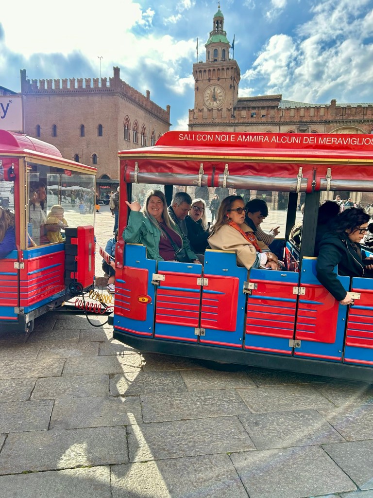 After the church I let Margaret talk me into doing the little train around the historic sites. We had missed the hop on and off bus so the train was our option. It was slightly bigger than a kiddie train but not much. Only Margaret, Clark and I suffered through it. Everyone else went and had a drink. We however had 45 minutes of torture. We got on a row with the wheel beds and didn’t have room for our feet unless we basically hugged our knees. Surprisingly the little train went right out with traffic. Nothing like looking up to a bus when you are in a toy. We survived and we did learn a bit about Bologna so all in all not horrid but I wouldn’t do it again.