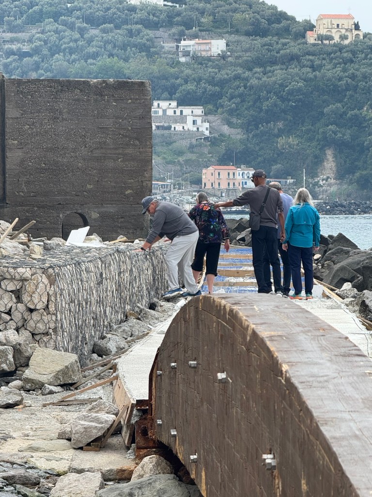 All but Faye and I decided to attempt the closed path into town. The concrete had set in the parts they had done so they thought it was passable. Jeff had gone down earlier and found a way over the rocks, under the bridge then up on the retaining wall over the unfinished parts. After breakfast they headed out. I considered it but couldn’t get motivated and decided to stay with faye and open a bottle of Prosecco.