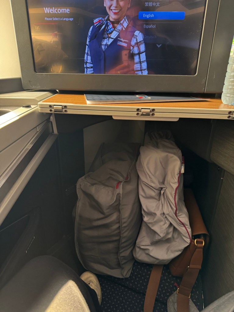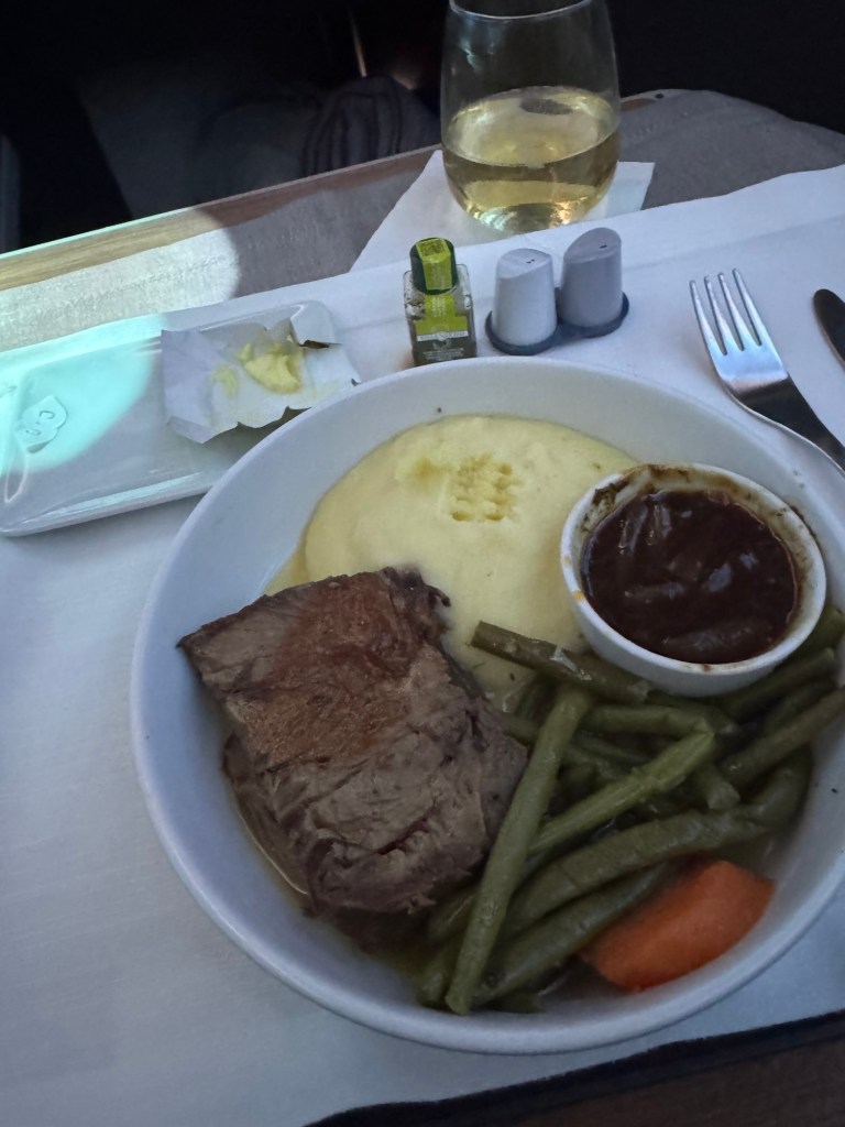 Our flight was a little late but not bad and soon we were boarding. I wish I could say the seat was not worth it but it was. I loved it. Plenty of room for all your stuff. A large screen to watch the movies on and great headphones. I didn’t use the cushion to make it into a bed but I did lay it down and sleep for a while. It was a little over 9 hours and I watched 3 movies and had two meals. The first was the best airplane food I have ever had served on a real plate with actual utensils. Desert was an ice cream sundae that I could have the toppings I wanted. There was no warm cookie snack and I was a little sad about that. In fact I was a little disappointed in the snacks. They didn’t offer anything between the meals and the second meal was more snack with a bunch of Mediterranean things on a plate which I didn’t enjoy. But the seat was still nice and I wish I could do it every flight.