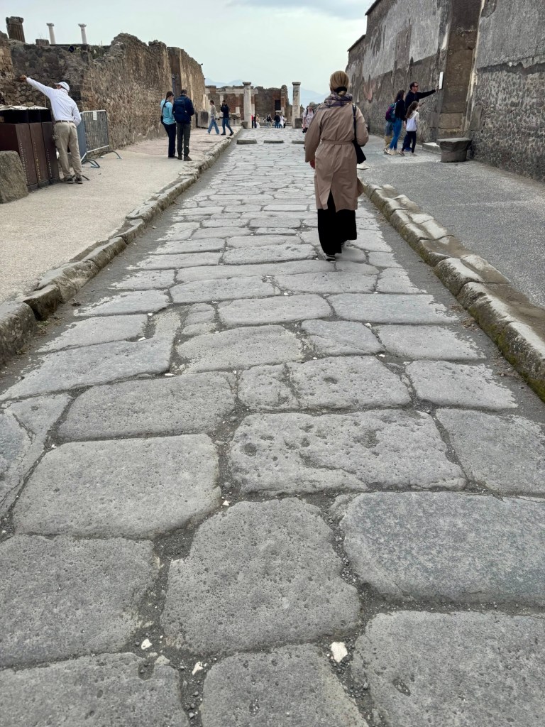 The guide also explained the roads and pavement of the cross blocks required the use of a very particular size of carriage or wagon. It allowed the locals to set tolls or collect money from visitors who needed to change from their traveling carriage or chariot back in the day to the size that fit the roads in Pompeii. You can see the groves in the roads from everything being the same size.