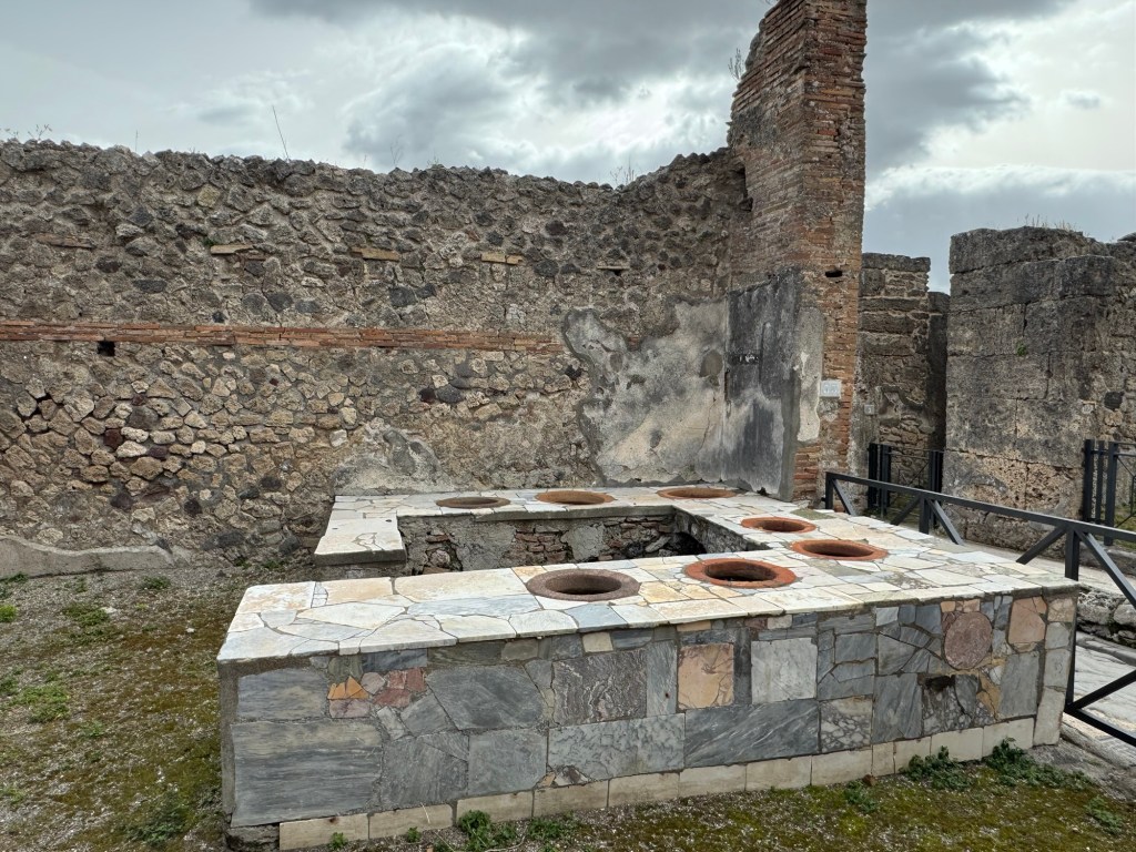 As to the bakeries and food services the setups were quite elaborate for 79 AD. the “fast food” locations had counters with several large post to keep the premade food warm and make it easy to grab and go.