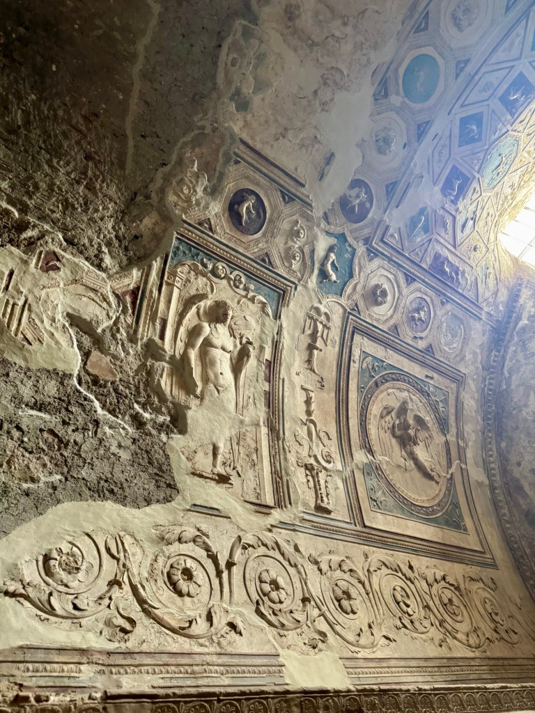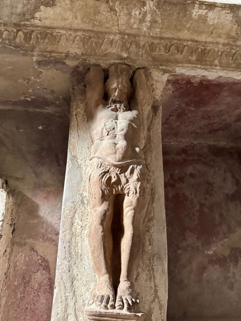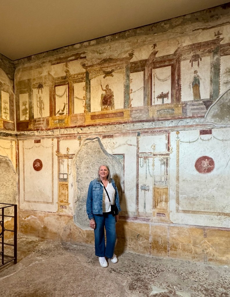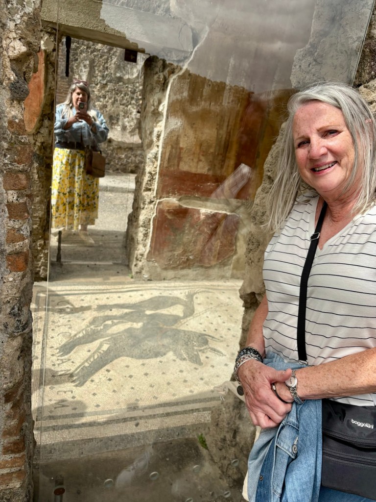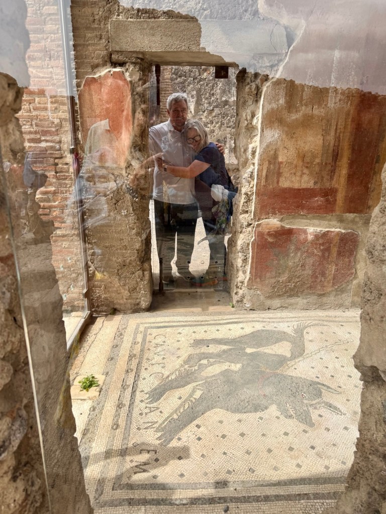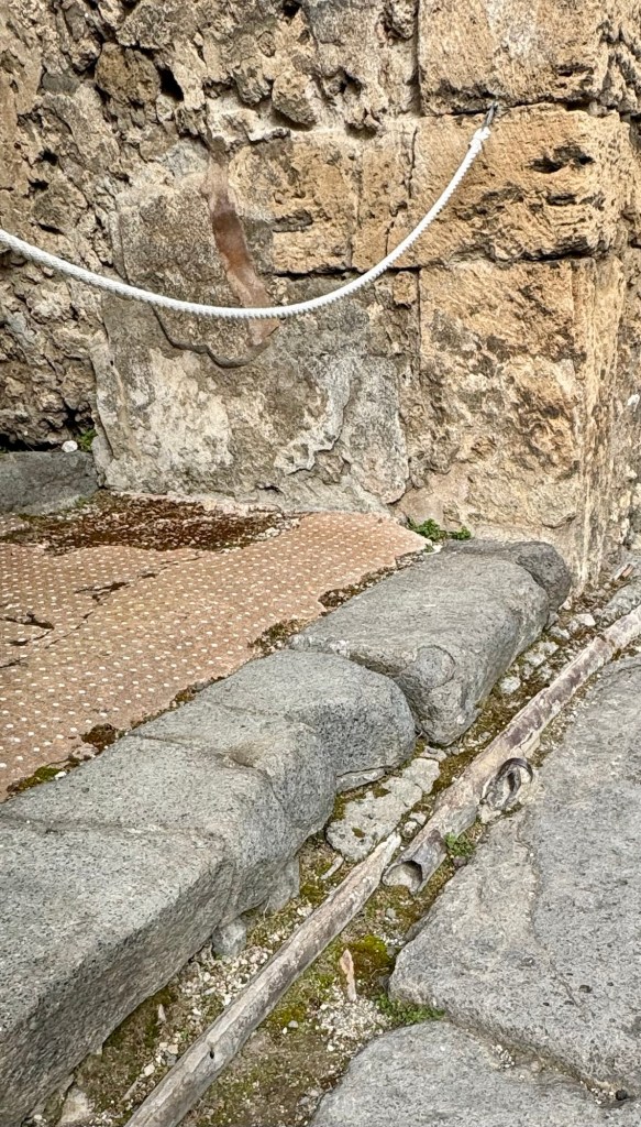 She was another excellent guide and we learned a lot about how life worked in Pompeii. It was way more advanced than I realized. The city was set up on the grid system and had roads running east and west and north and south. It also had established districts for shopping, restaurants, even fast ready made food that was purchased to take home and eat. You could identify the businesses by a rut in the doorway where a sliding door would have been to slow them to shut it down when closed.
