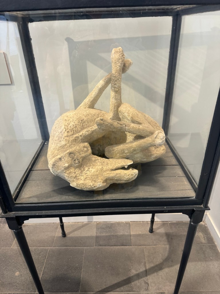 Out in the main square they had some of the plaster casts of the people that they found. She explained how these were made and it was totally different than what I thought. At some point during the excavation someone realized they were coming across hollow areas in the ash. Instead of just breaking through it he pumped plaster into the hollow area allowed it to dry and then dug it up. Seems the ash had harden long before the body decayed so as the body decayed the ash encompassed the shape of what had originally been there. the plaster holds the bones but otherwise is just a solid representation of space that was left in the ash. She said they also had plaster casts of plants because they couldn’t tell what the hollow space was until the plaster set and they got it out. The casts of the plats has helped them identify plants and bring them back to be in the gardens that have been reestablished.