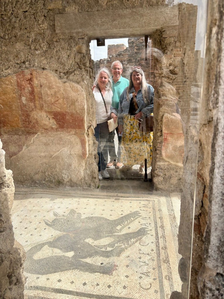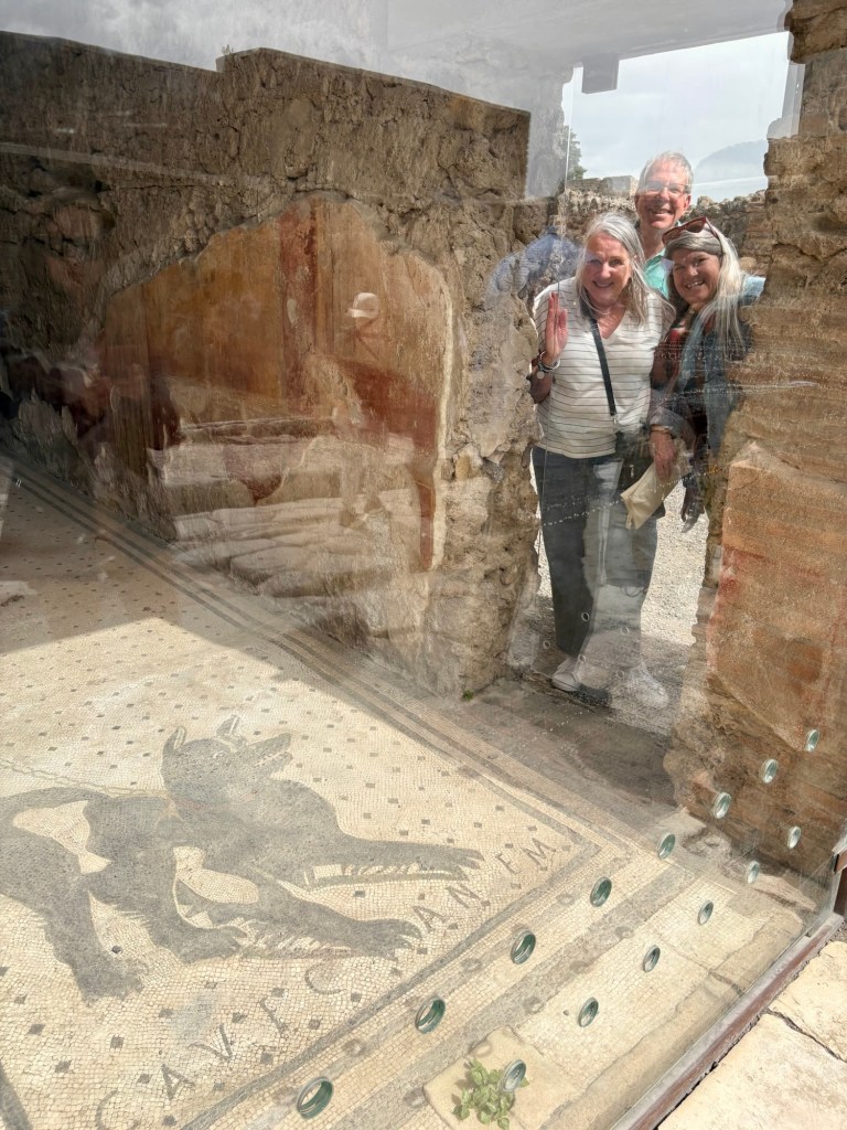 After the museum we realized we had not seen the tiled floor depicting the dog. We had a bit of time left so we asked directions and headed back in to find it. I am glad we did. It wasn’t far from the main square and right by the bath we toured. Not sure why the guide skipped it. The floor is only decorative so maybe she didn’t think it had relevance to the cultural aspect of the city. Regardless I am glad we went back in to see it. we all had our photo with it.