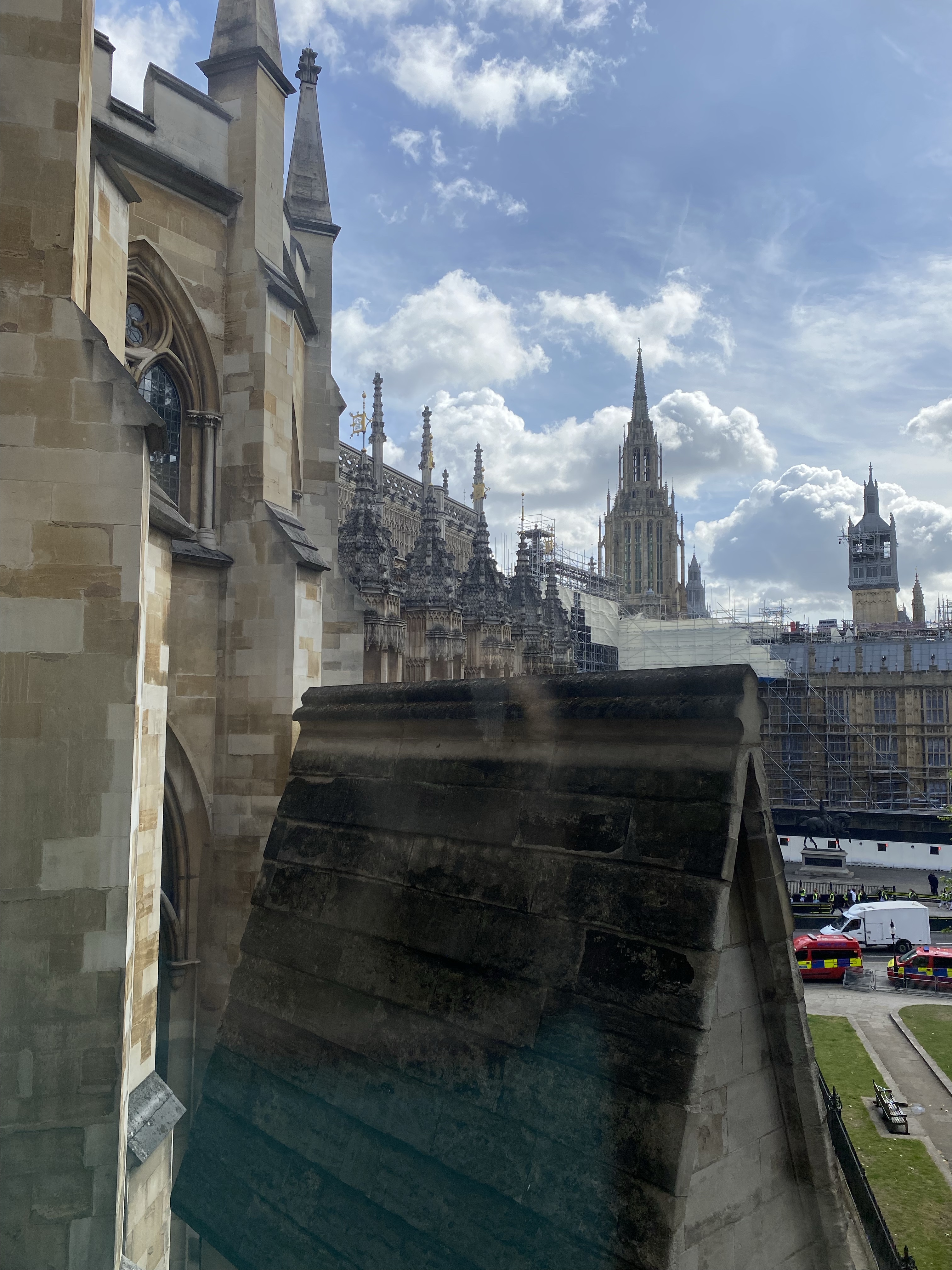 The exhibit was amazing and vantage point of looking both out over the abbey floor and the the spires of the church up close were added benefits. Sadly though they didn’t allow photographs. All we had was what we took climbing the stairs and one rushed clandestine picture of the gargoyles that Val took while I distracted the docent.