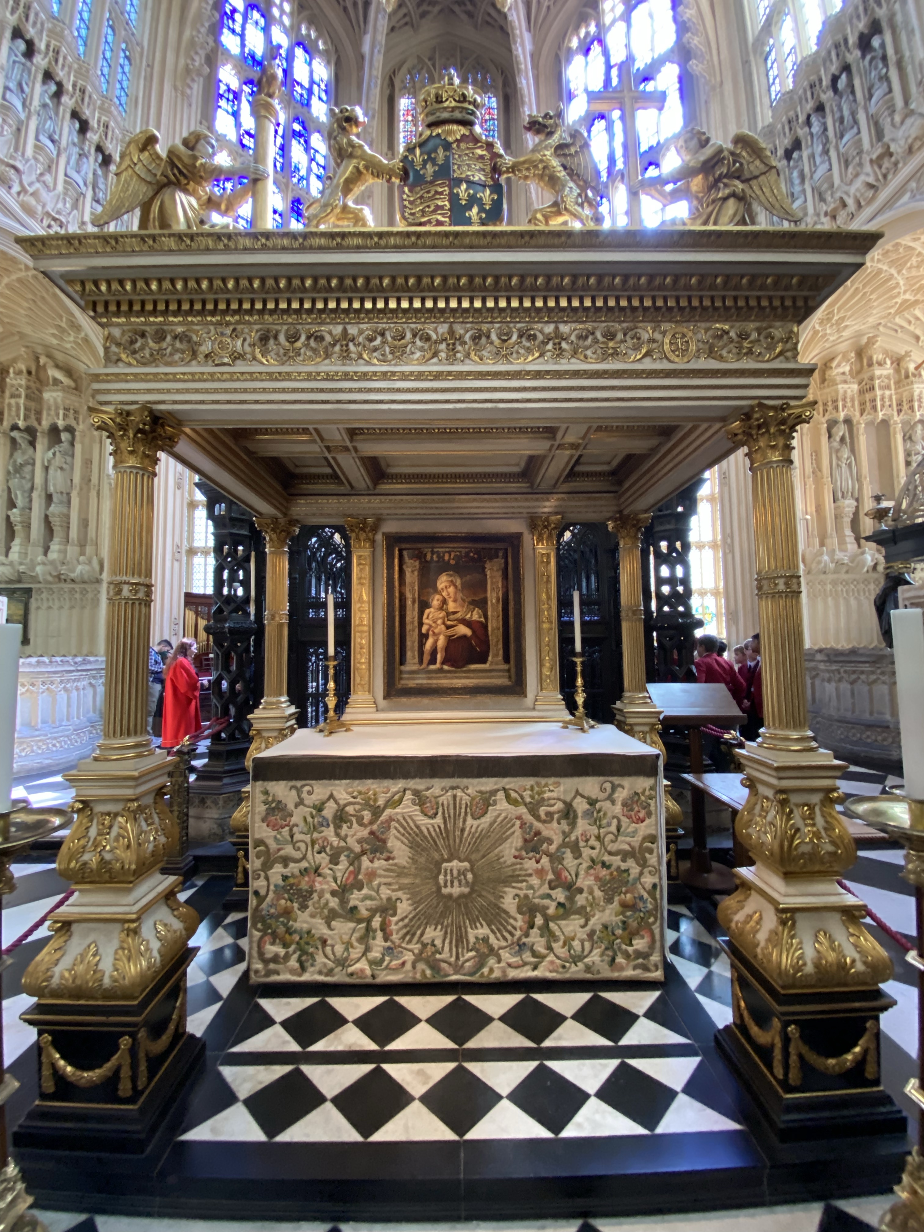 Our last stop was the Vyne. A medieval manor home visited by Henry and Anne on the 1535 progression. It also was a family home until 1950 when it was gifted to the National Trust. The grounds were open to everybody and they were quite busy. We were the only ones that got to tour the house. The Tudor great hall was still pretty much as it was back in the day. It has wood paneling which other than tapestry was used to warm up the rooms. The paneling was full of pomegranates and Tudor rose carvings. So there was a Katherine of Aragon connection ( her family standard was pomegranates) but I can’t remember what it is. a smaller room off to the side had some nice dark colored tapestries. The dark background makes them unusual for the age. They were much more careful with these tapestry then at the place with those detailing what they thought America looked like. These the windows were covered over and the room was kept dark.