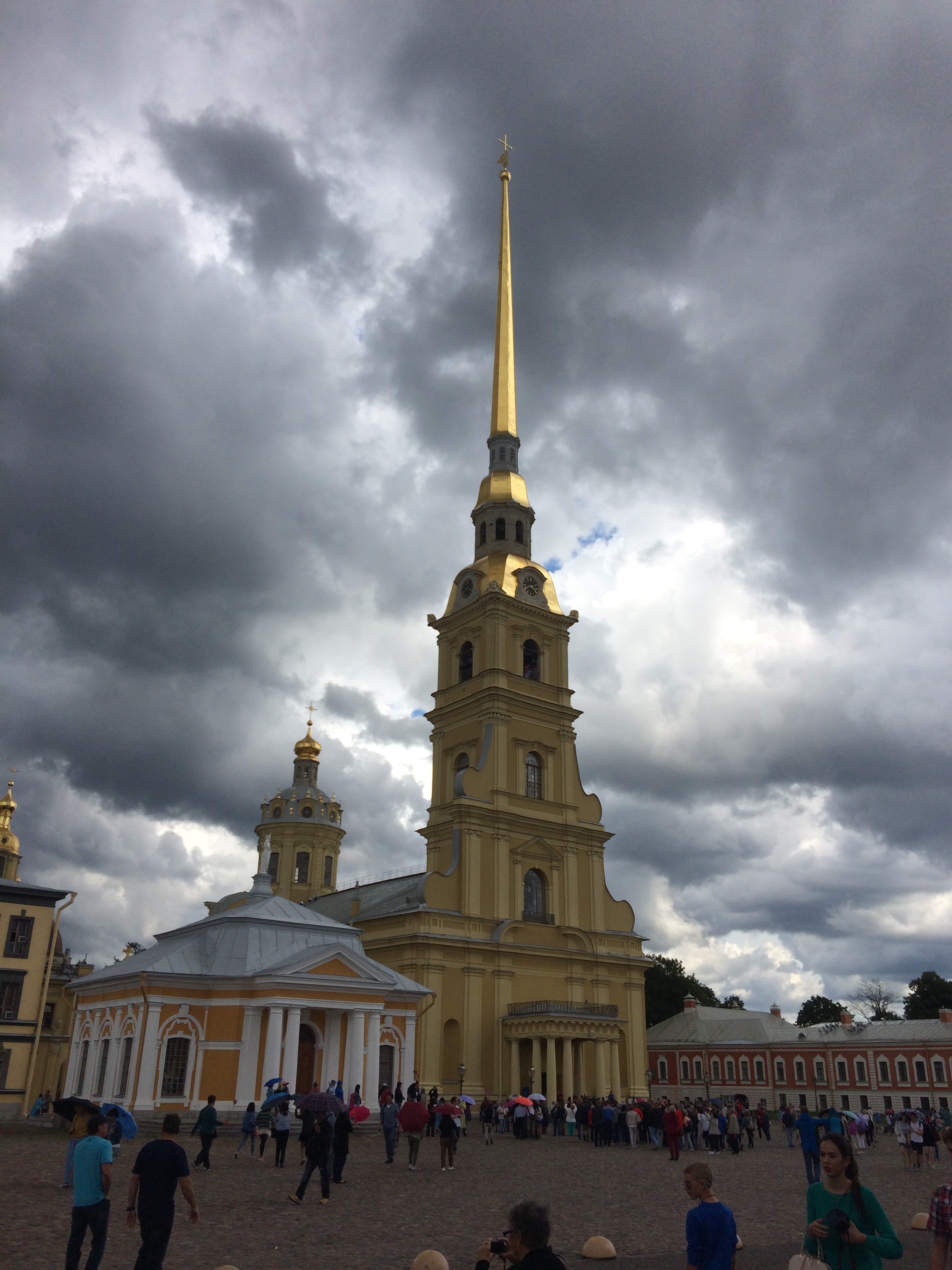Our last stop was the church with all the czars tombs. We had seen it in the distance but had never driven by it. Located on an island there was just one way in and traffic was horrible. Right as we arrived the afternoon storm hit. We got inside the church just in time. Of course so dos everyone else and with the rain keeping people from leaving it was a packed house. With all the tombs the church was hard to maneuver through. We basically followed some unwritten tour guide path that took us up the middle first then down the right side to the crypt for Nicholas and his family (and yes they claim all the children including Anastasia are accounted for) and then back up the left side for Peter and Catherine the Greats tombs. The inside was the Russian ornate gold leaf that was everywhere in St Petersburg so it dos not really stand out. One of the wife’s (and I cannot remember who) had a beautiful pink marble coffin otherwise it was just another Russian church.